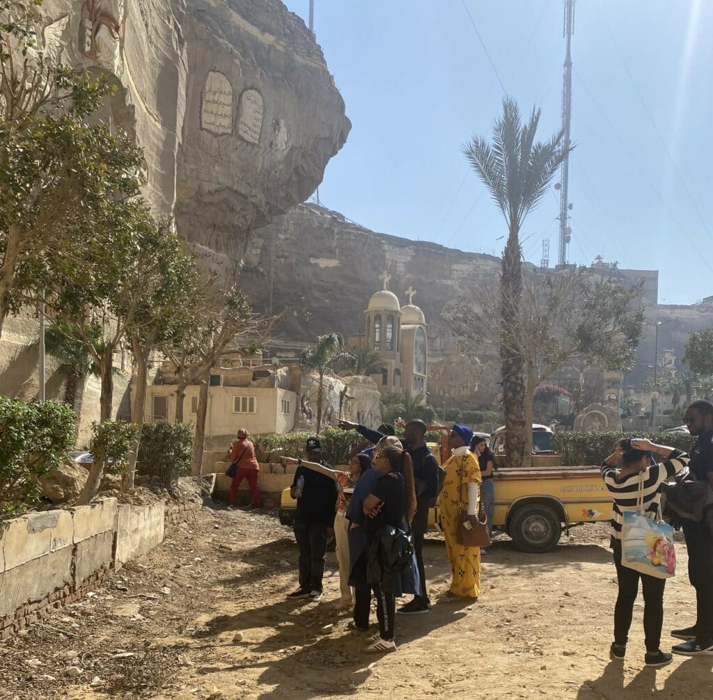 Samedi 15 mars, nous avons visité en Eglise le monastère et ses églises à Saint Siméon, construit dans la falaise du Mouqattam au Caire, dans une grotte immense. Quelle belle aventure de traverser le quartier des chiffonniers, de franchir le poste de police installé comme une forteresse, de découvrir les versets bibliques sculptés écrits en arabe dans les parois le long du chemin vers l’église et de les lire en français dans nos Bibles : Chrétiens de différents pays africains ou européens et chrétiens égyptiens – Nous vivons de la même Source ! Quelle belle communion.